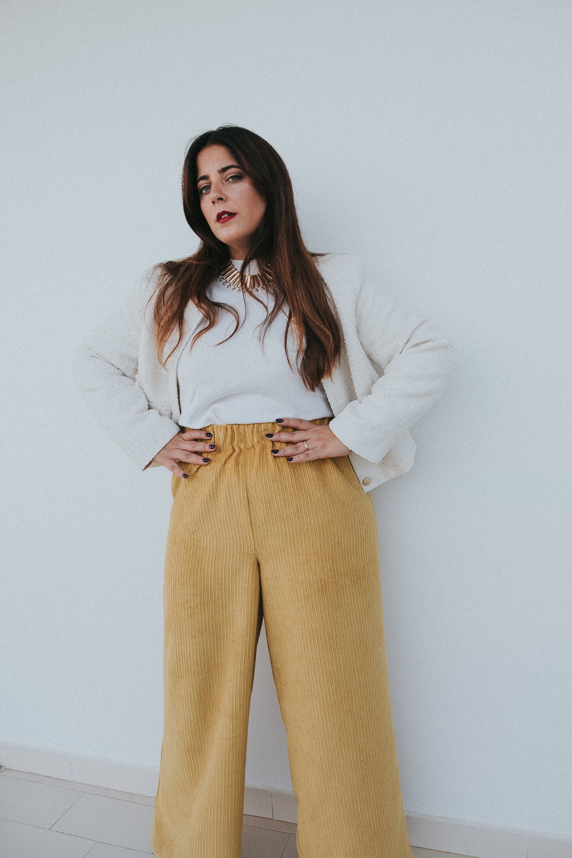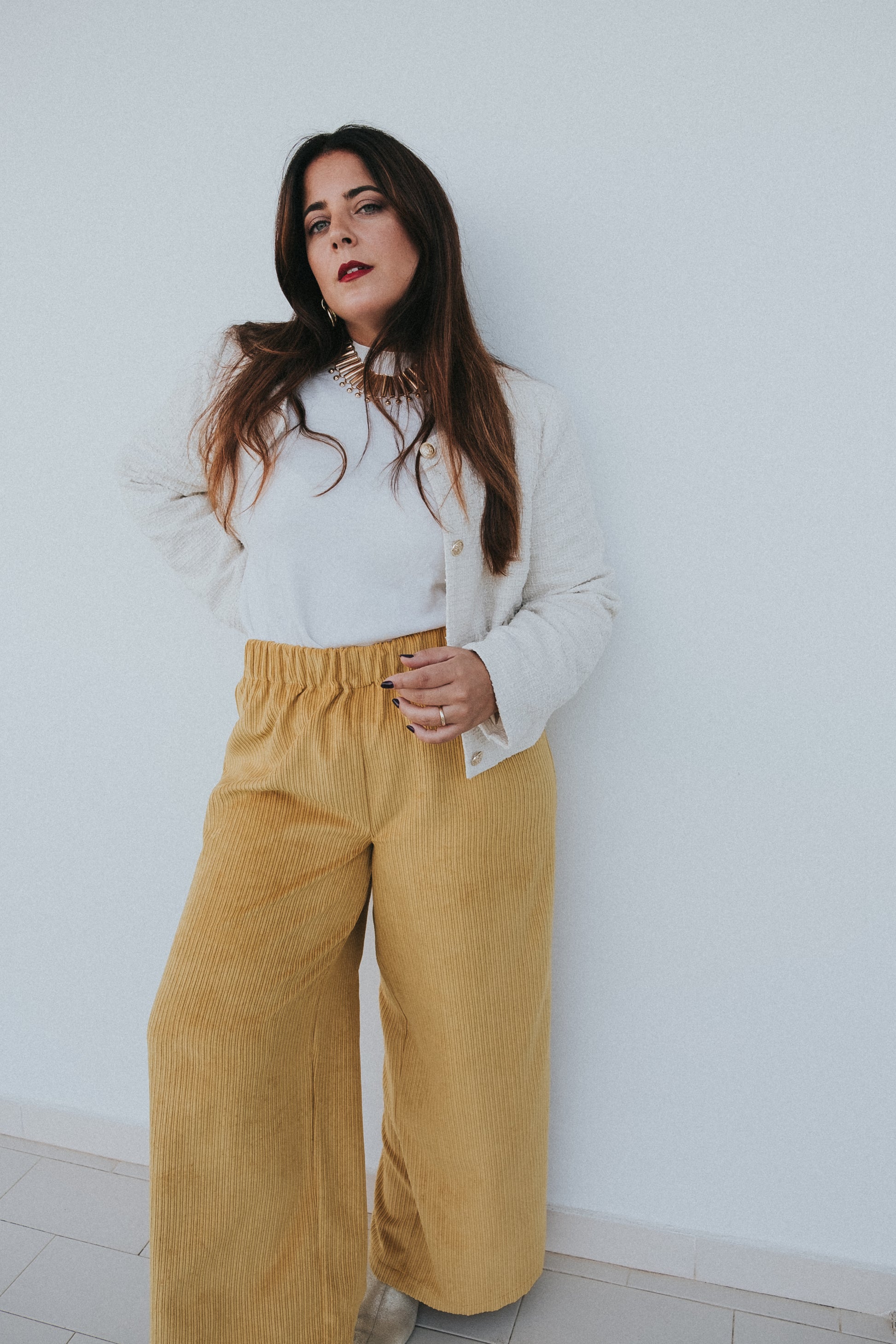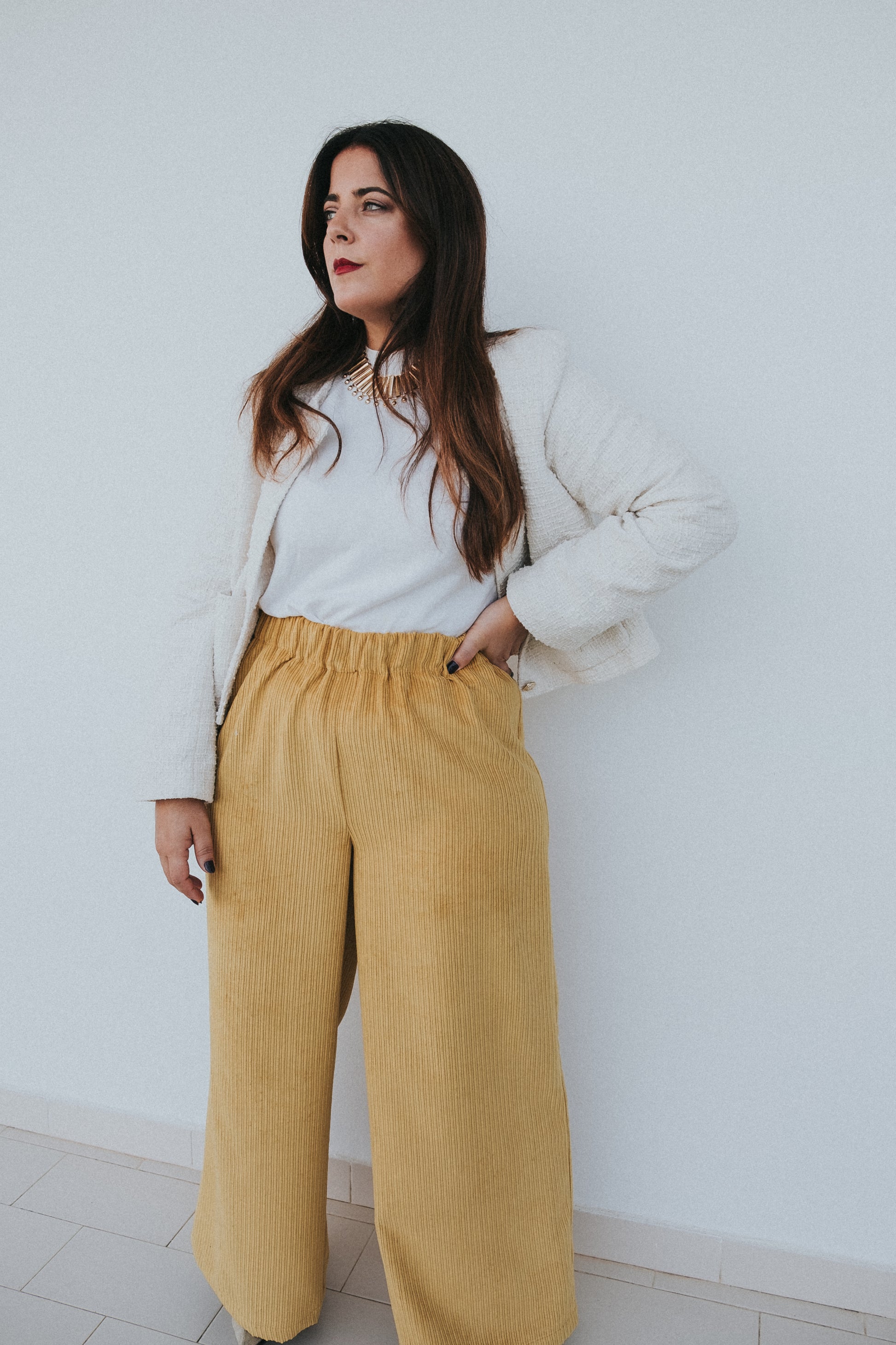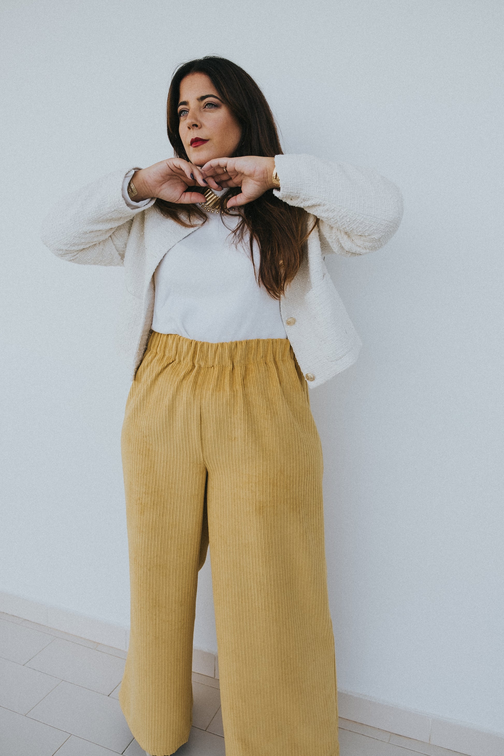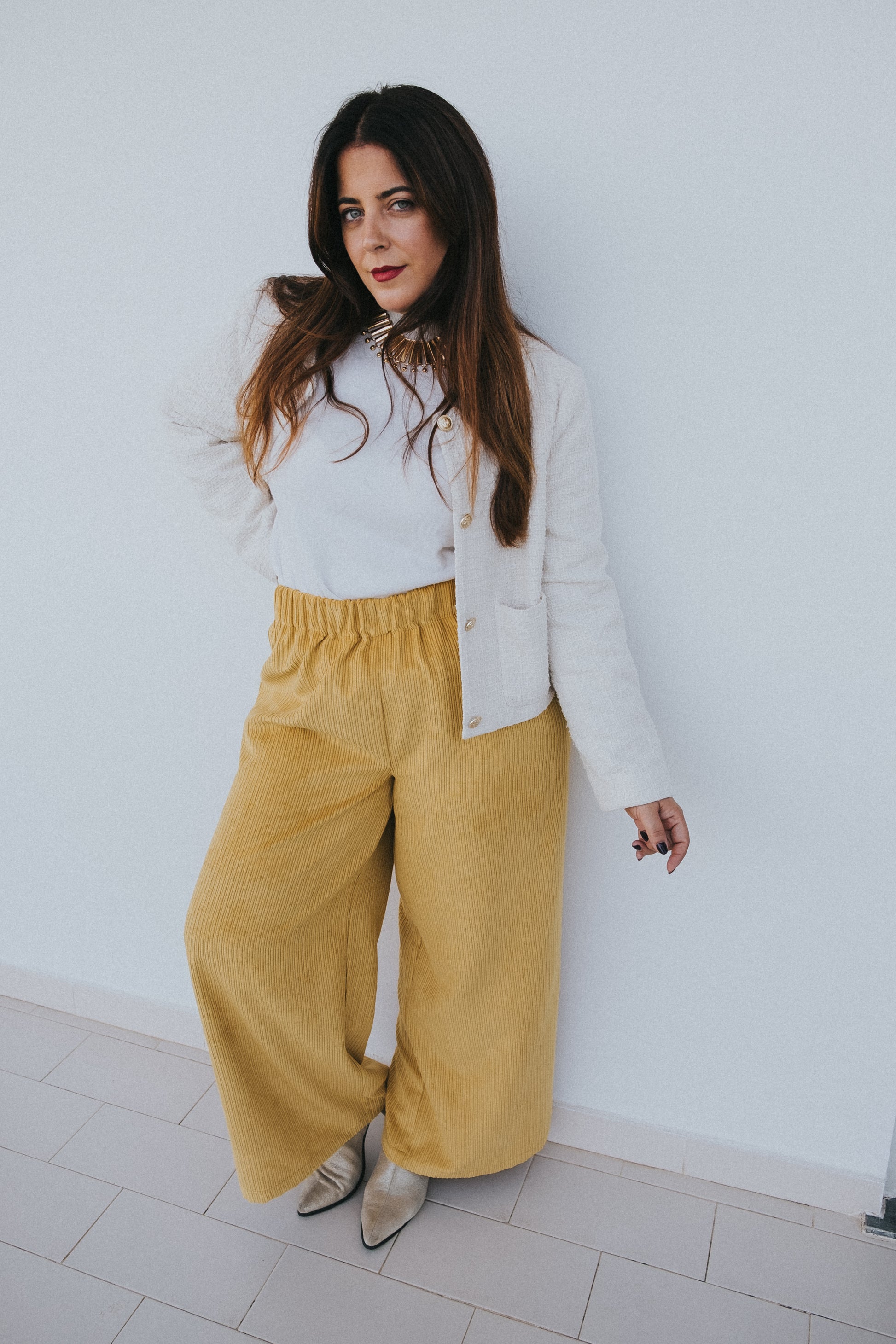 Calças em mostarda / amarelas tecido bombazine.