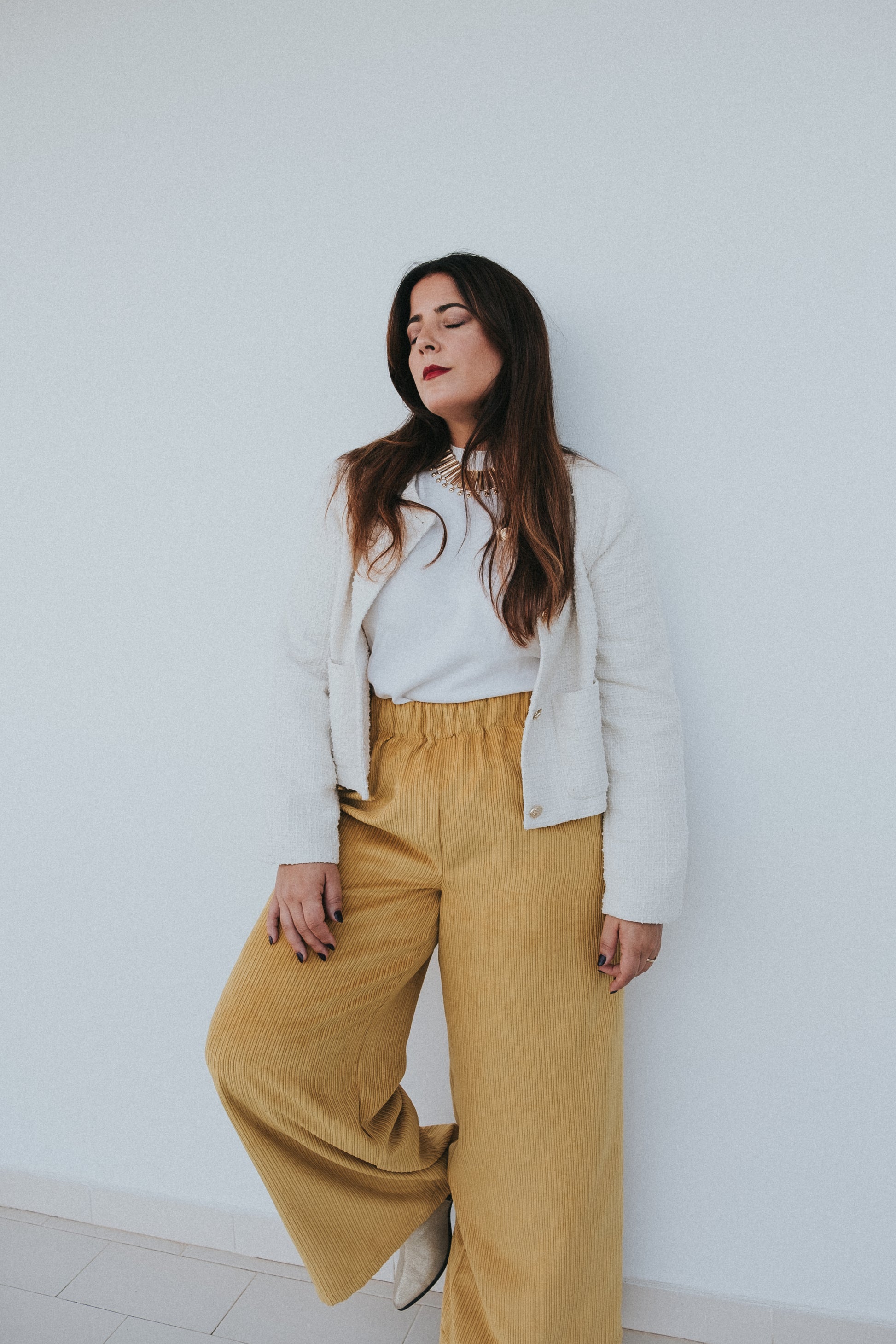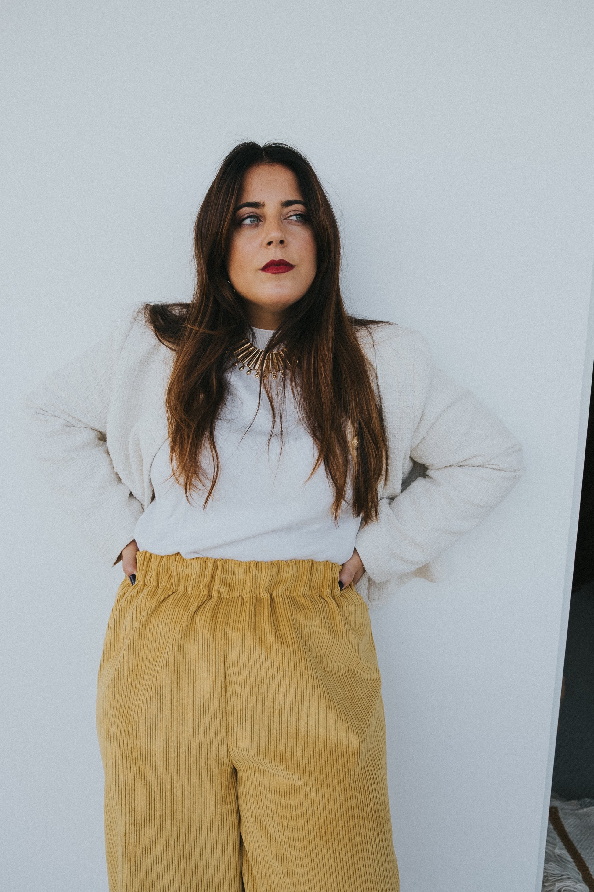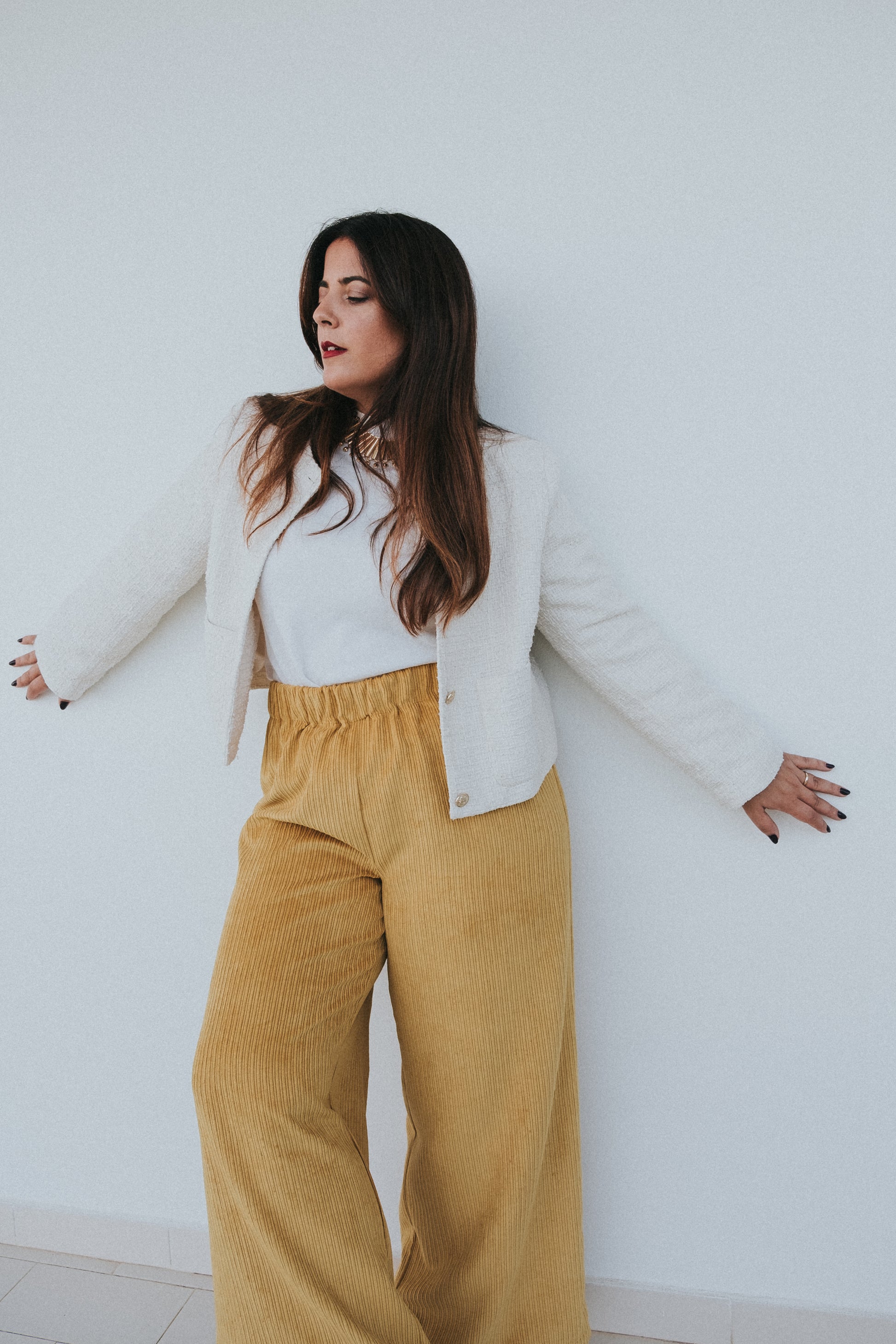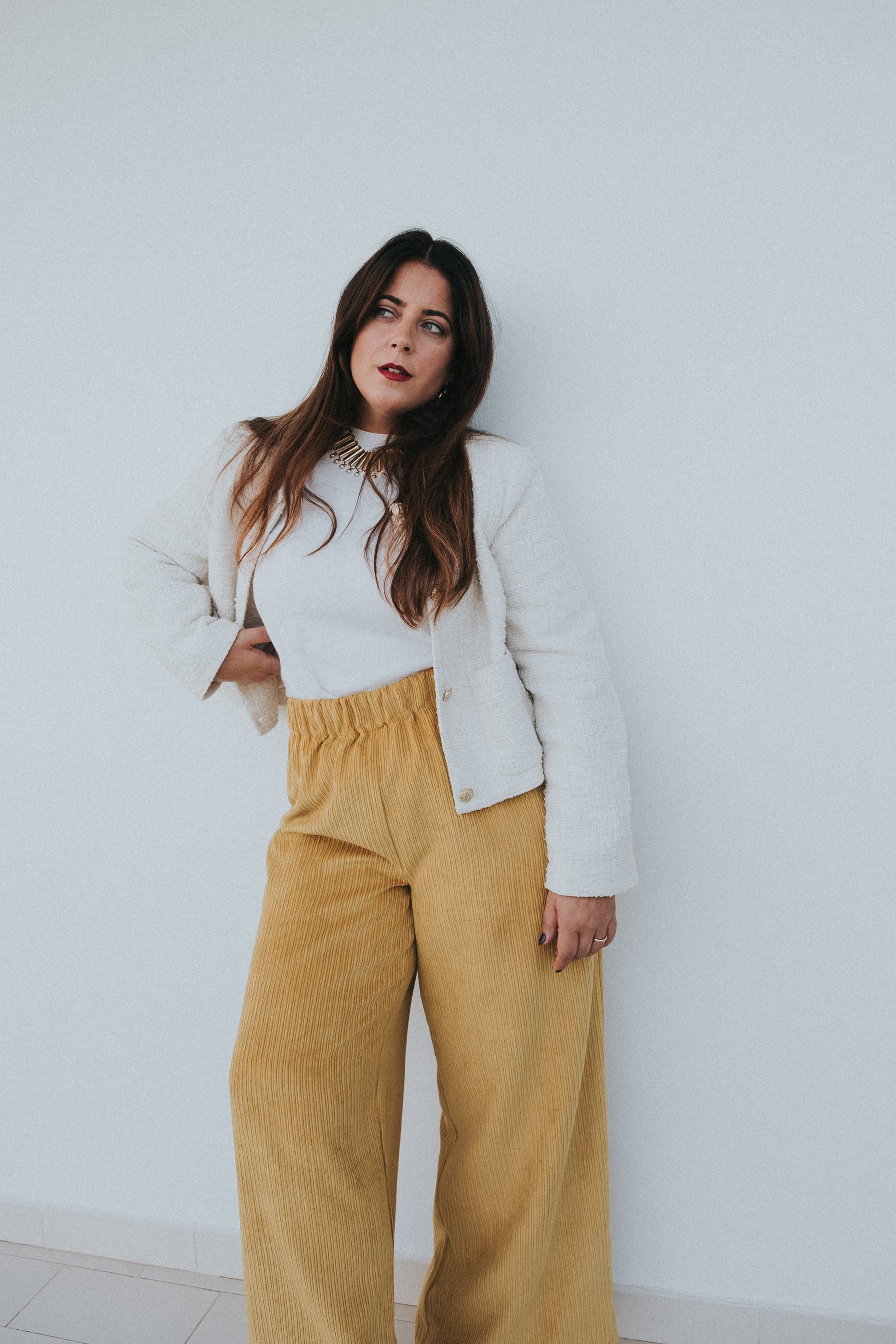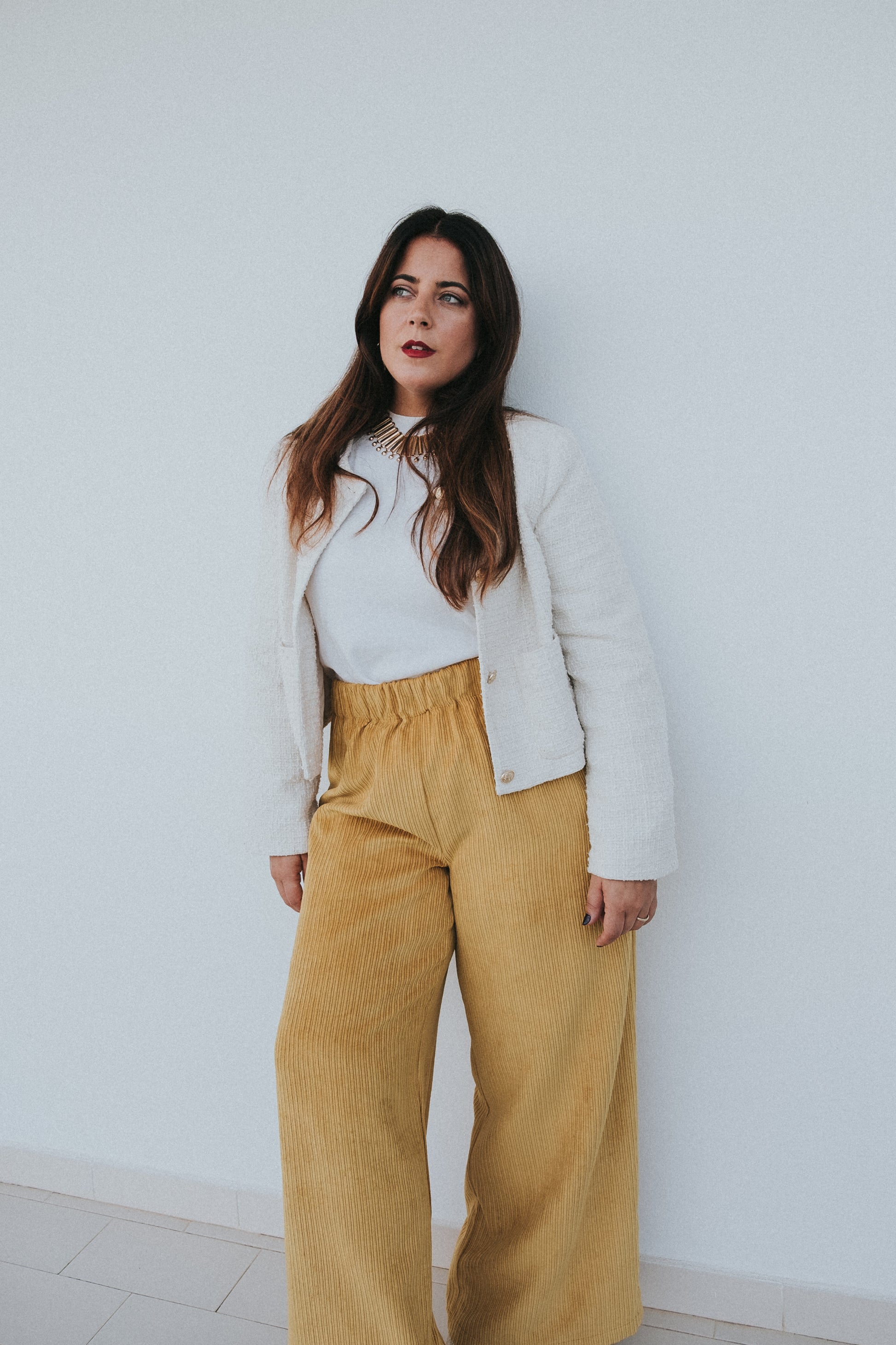 Calças em mostarda / amarelas tecido bombazine.
